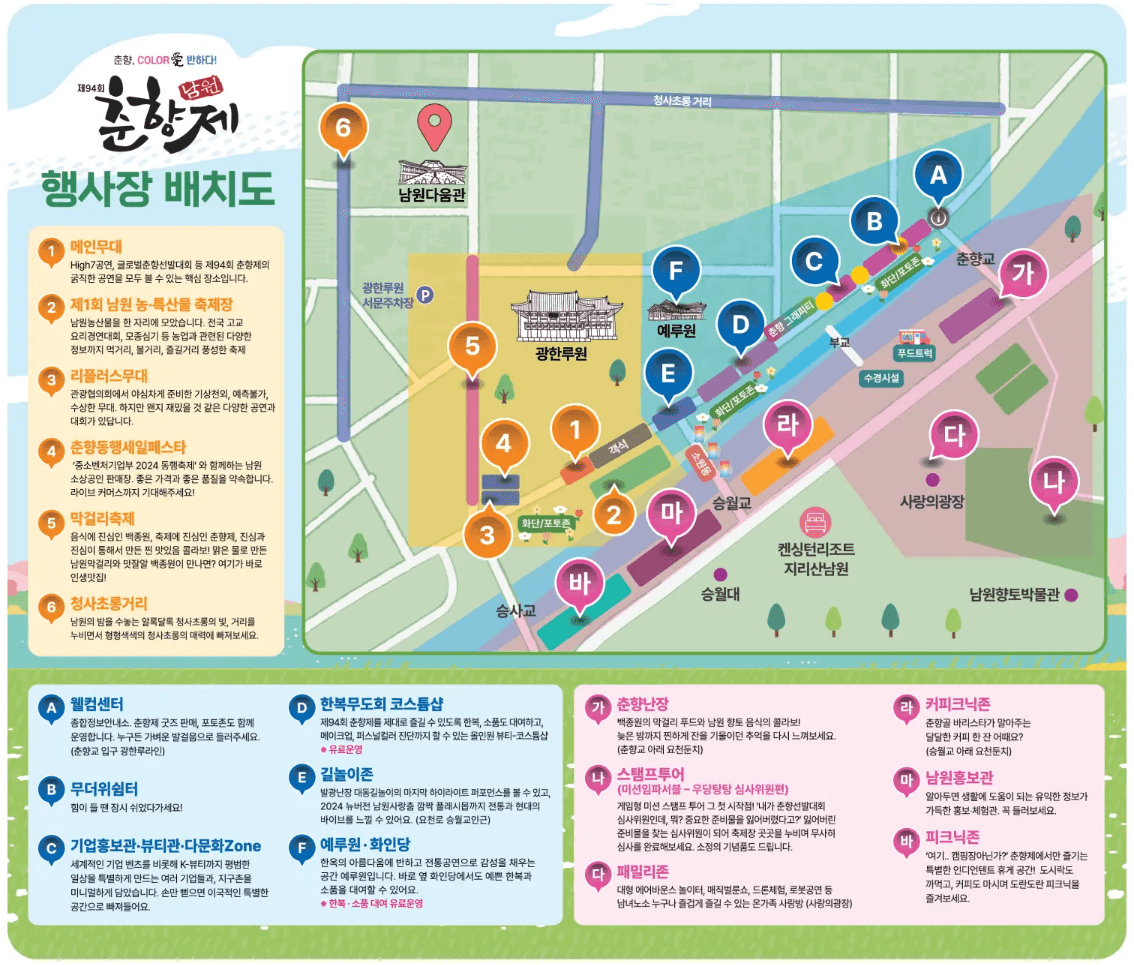 ✅ 장소 : 광한루 및 예촌일원, 춘향테마파크, 사랑의 광장, 요천둔치, 요천로, 광한서로, 의총로 및 남문로