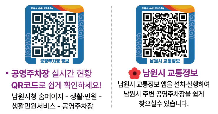 QR 코드를 이용하여 공영주차장과 남원시의 교통정보를 빠르게 찾으실 수 있습니다.
